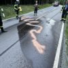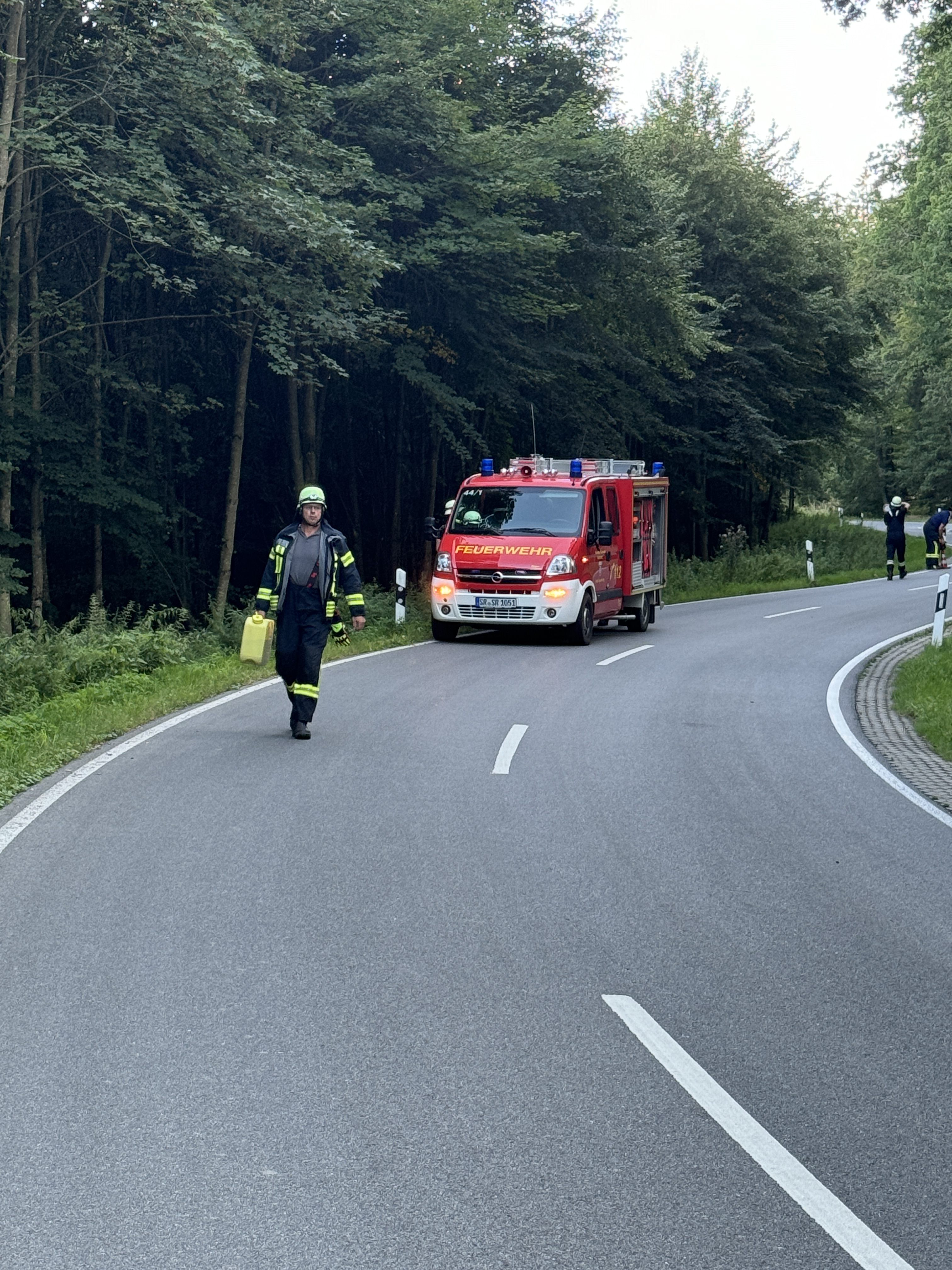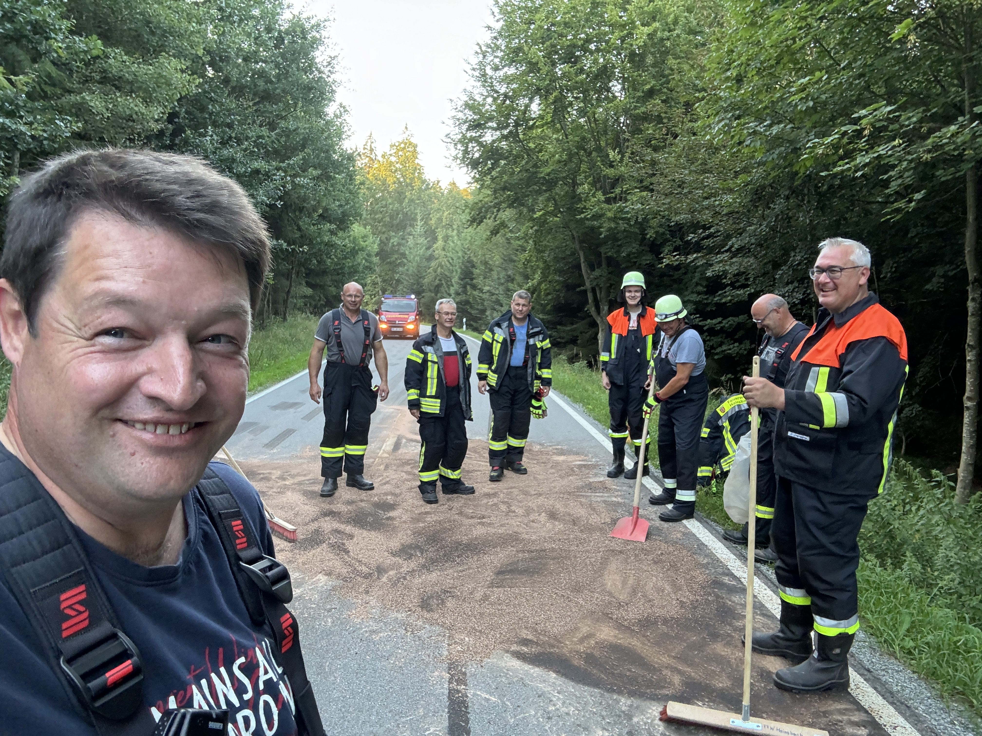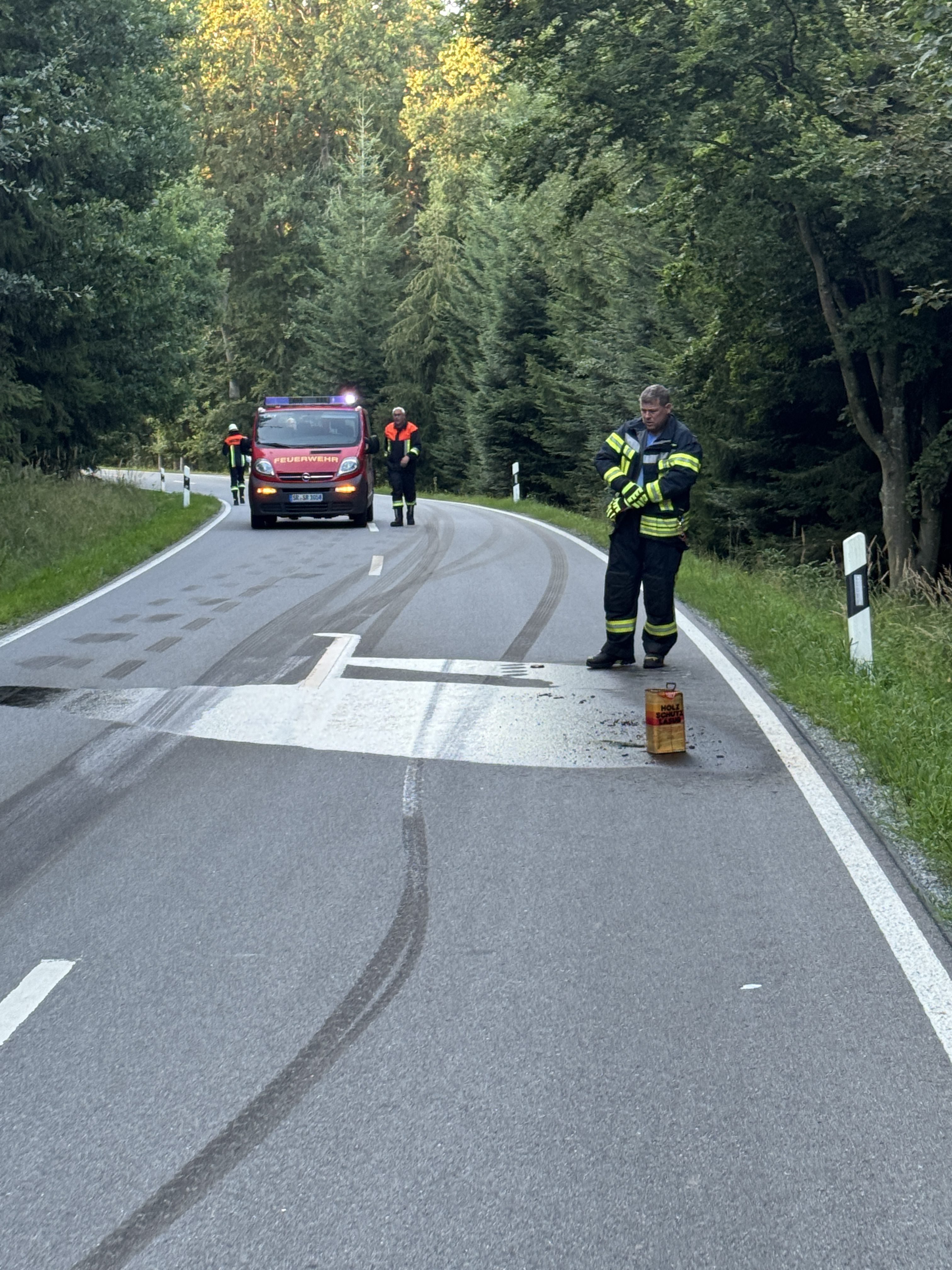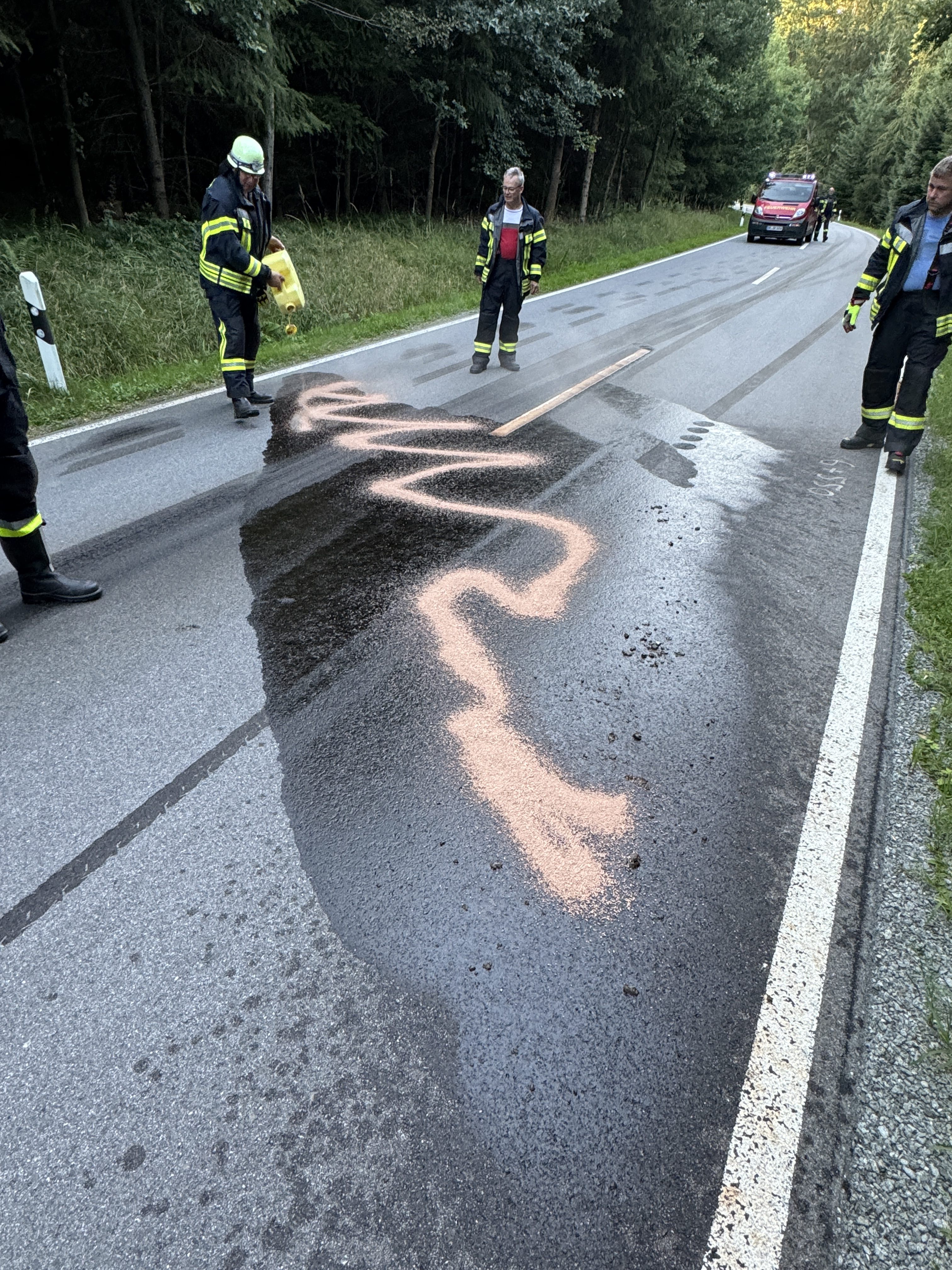 Wir wurden von der ILS Straubing zu einer Ölspur im Waldstück nach Wissing alarmiert. Es stellte sich heraus das es sich bei der Spur (sehr großer Fleck) um Holzschutzlasur handelte. Nach Rücksprache mit dem Gefahrgut KBM Uttendorfer konnten wir nur die noch nicht eingtrockneten Reste mit Bindemittel entfernen. Abwaschen war als Erstmaßnahme nicht möglich da es sich um giftige Farbe handelte (Farbkübel lag neben dem Fleck). Nach 2 Stunden konnten wir wieder abrücken und die Straße der Straßenmeisterei übergeben, die Warnschilder aufstellte.
